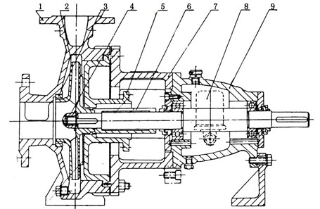 1-泵体 2-叶轮 3-密封环 4-叶轮螺母 5-泵盖 6-密封部件 7-中间支架 8-轴 9-悬架部件